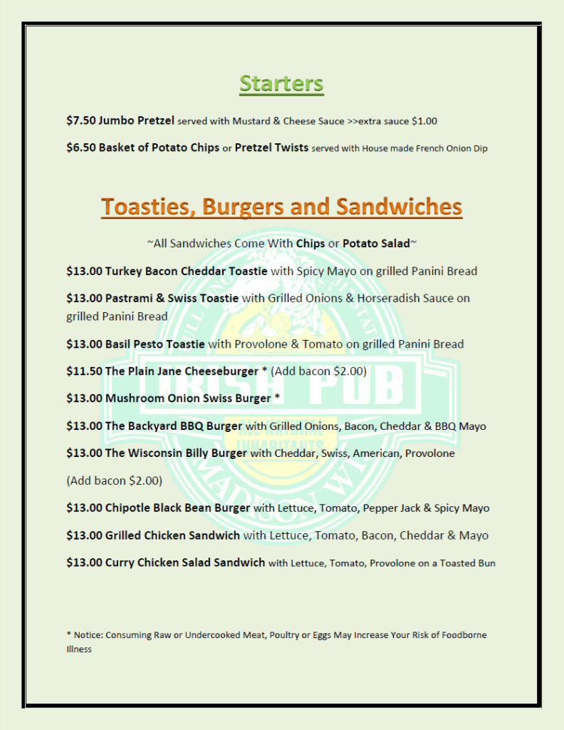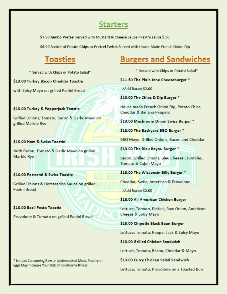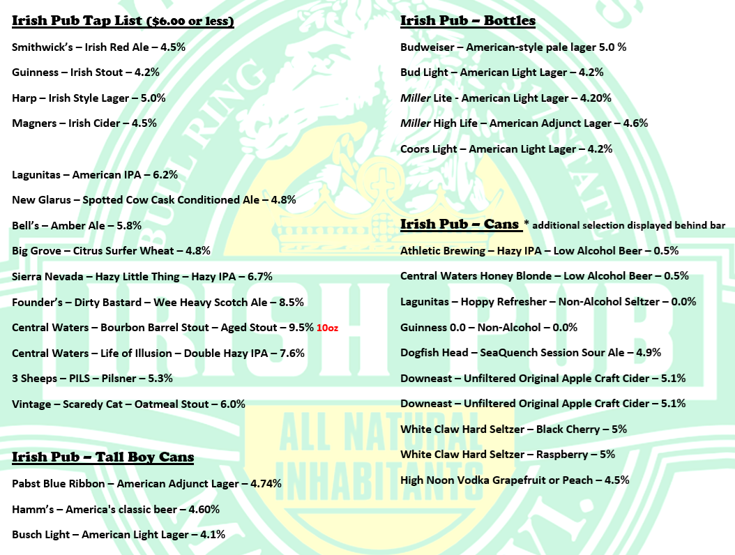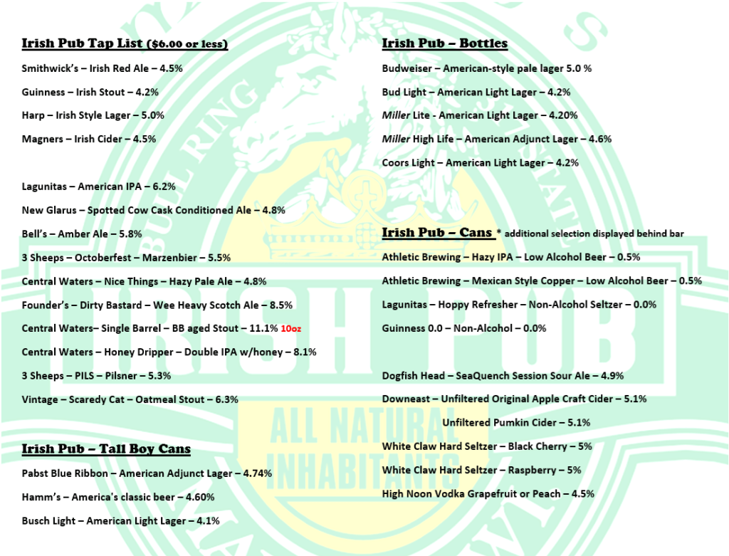 Click on the menus to enlarge. Day Menu Evening Menu Taps, Cans and Bottles 10/30/2024 Share this: Share on X (Opens in new window) X Share on Facebook (Opens in new window) Facebook Share on Tumblr (Opens in new window) Tumblr Email a link to a friend (Opens in new window) Email Print (Opens in new window) Print